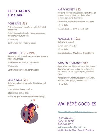 Our mission at Wai Pēpē Goodies is to promote sustainable beekeeping practices and educate the public about the health benefits of herbal honey products. We are reaching back to the past and bringing forth the old ways of delivering sweet medicine in the form of electuaries and oxymels.